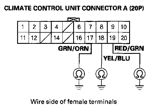 4. Check for continuity between body ground and climate control unit connector A (20P) terminals No. 17, 18 and 19 individually.