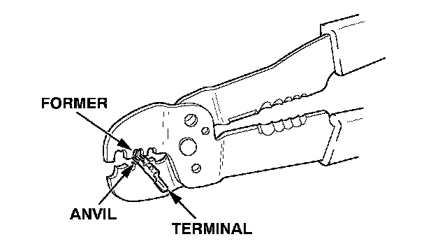 4. Position the terminal in the crimping tool slot with the solid portion of the terminal toward the anvil and the open section toward the former.