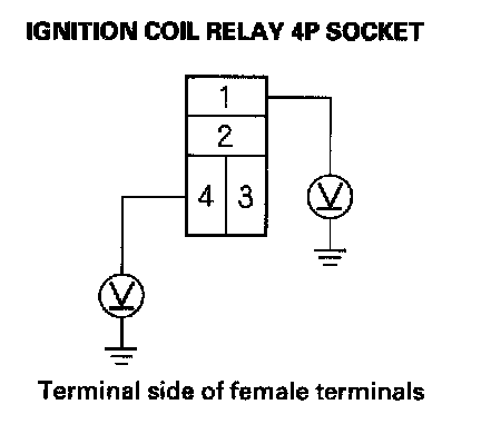 3. Measure the voltage between ignition coil relay 4P socket terminal No. 1 and body ground, then terminal No. 4 and body ground.