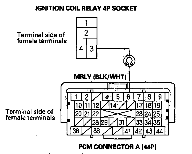 NO - Repair an open in the wire between ignition coil relay 4P socket terminal No. 3 and the PCM (A6).