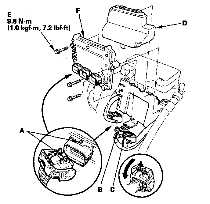 5. Remove the mounting bolts (E), and remove the PCM (F).