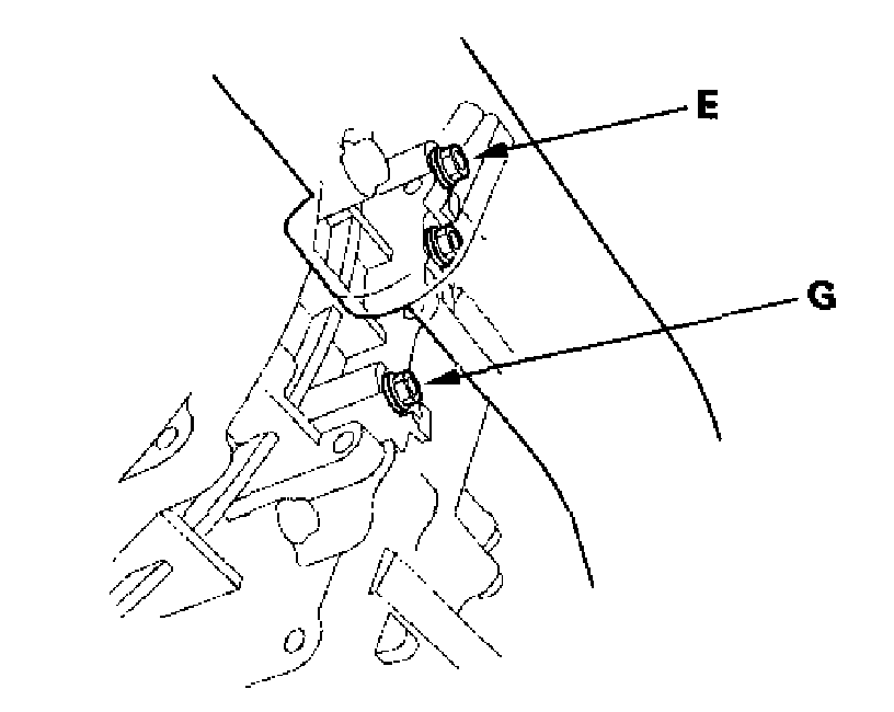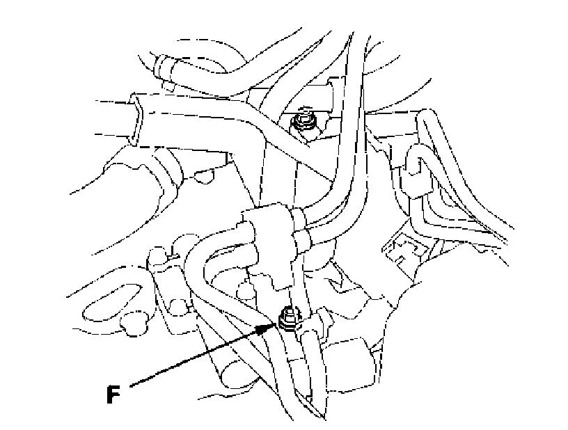 25. Shift to the D position; the transmission shifts into 4th gear, then 5th gear. Measure the 4th clutch pressure at the 4th clutch pressure inspection port (F) and the 5th clutch pressure at the 5th clutch pressure inspection port (G) while holding the engine speed at 2,000 rpm.