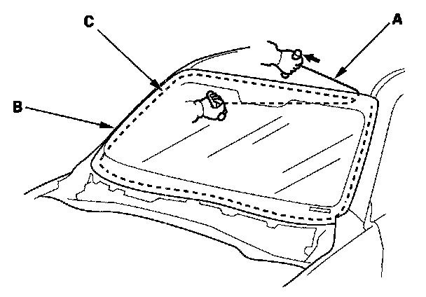 13. Attach the molding (A) with adhesive tape (B) to the edge of the windshield (C):