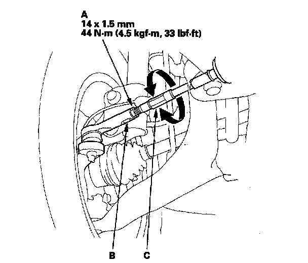 3. Loosen the tie-rod locknuts (A) while holding the flat surface sections (B) of the tie-rod end with a wrench, and turn both tie-rods (C) until the front toe is within specifications.