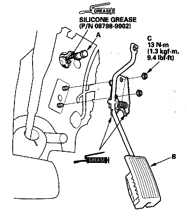 Remove the throttle cable (A) from the accelerator pedal (B).