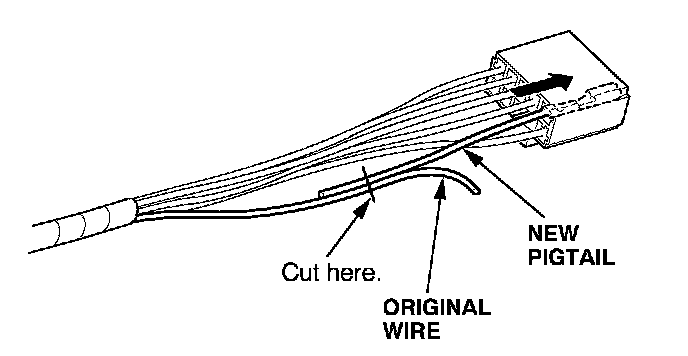 6. Lay the pigtail and the original wire side-by-side, and cut off both ends at once. If you are making more than one splice, do not cut each pigtail at the same location; the resulting "lump" of splice connectors would interfere with rewrapping the harness. Instead, cut the first pigtail close enough to the terminal so you will have room to make each remaining cut about 20 mm (3/4 inch) farther down on the next pigtail.