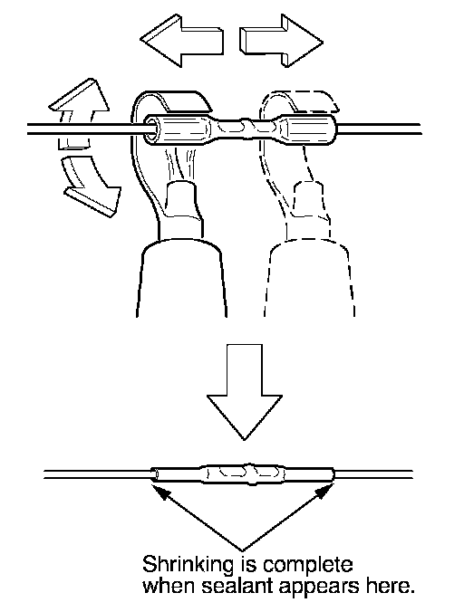 13. Plug in the heat gun, and turn it on. Start at the middle of the splice connector, and move the gun toward the ends as the tube shrinks. Apply heat evenly by rotating the curved heat spreader around the splice connector. Shrinking is complete when a small amount of sealant appears at each end of the tube.