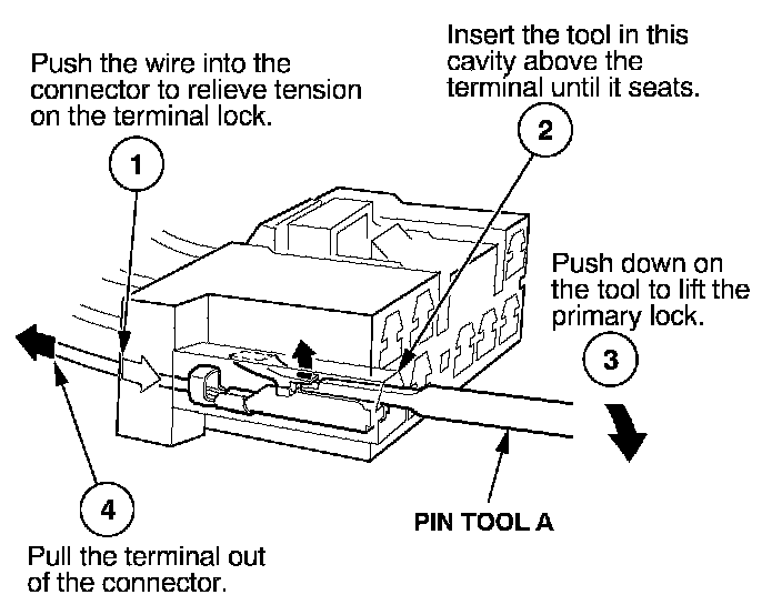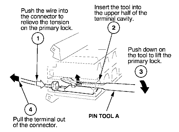 Before you begin, inspect the wire you are about to repair for damage and length. Make sure the wire will be long enough to make a terminal repair without stretching it when you reinstall the terminal in the connector. If the wire is too short, or if access to the connector is too restricted to make a terminal repair, you may need to install a pigtail terminal (a short length of wire with a factory-crimped terminal on it). Refer to HOW TO INSTALL PIGTAIL TERMINALS.