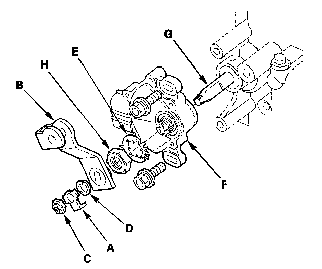 10. Pry the lock tabs of the lock washer (E) on the transmission range switch (F), hold the selector control shaft (G) with a 6.0 mm wrench, and loosen the locknut (H).