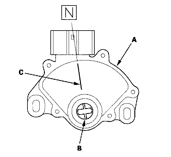 12. Set the new transmission range switch (A) to the N position. The transmission range switch clicks in the N position, and the control shaft hole (B) aligns with the N position line (C).