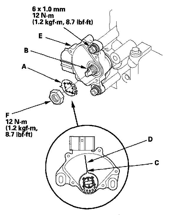 15. Install the new lock washer (A) over the selector control shaft (B) while aligning the projection (C) of the lock washer with the N positioning line (D) on the transmission range switch (E), and install the locknut (F).