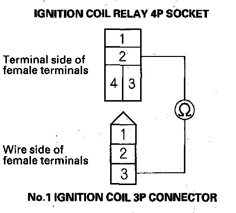 4. Check for continuity between ignition coil relay 4P socket terminal No. 2 and the No. 1 ignition coil 3P connector terminal No. 3.