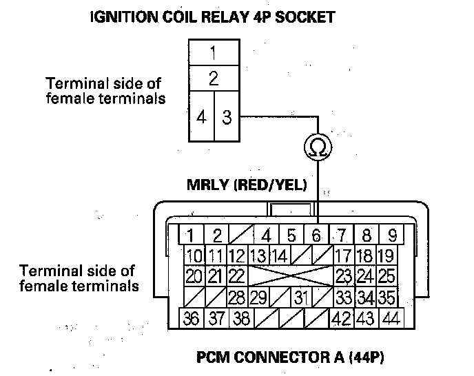 NO - Repair an open in the wire between ignition coil relay 4P socket terminal No. 3 and the PCM (A6).