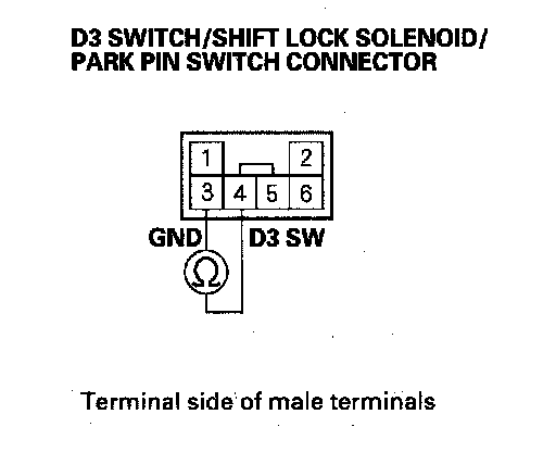 2. Check for continuity between D3 switch/shift lock solenoid/park pin switch connector terminals No. 3 and No. 4 while pressing the D3 switch and when the switch is released.