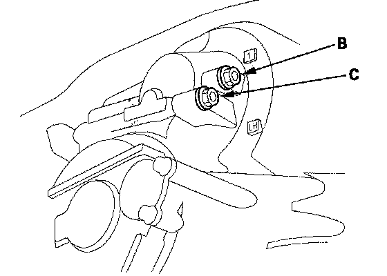14. Measure the 1st clutch pressure at the 1st clutch pressure inspection hole (B) and the 1st-hold clutch pressure at the 1st-hold clutch pressure inspection hole (C) while holding the engine speed at 2,000 rpm.