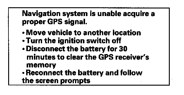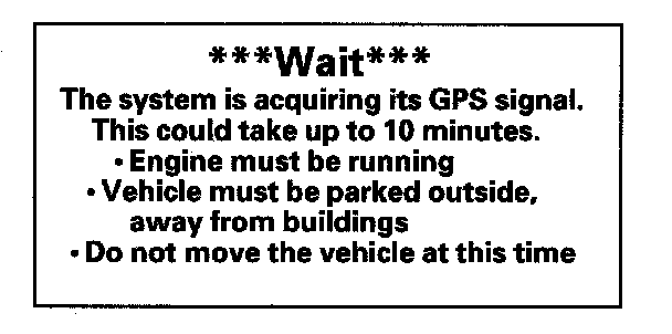 If the navigation system finds the satellites properly, this box clears, and changes to the Disclaimer screen. If within 10 minutes the system fails to locate a sufficient number of satellites to locate your position, the above screen appears.