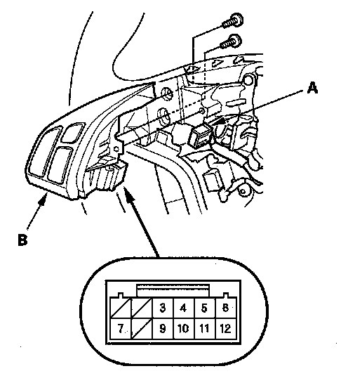 2. Remove the 12P connector (A) from the audio remote switch (B).