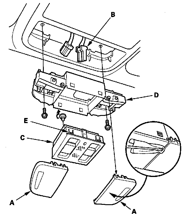 3. Carefully pry off the microphone (C) from the map light housing (D) while pressing in on the retaining tabs (E).