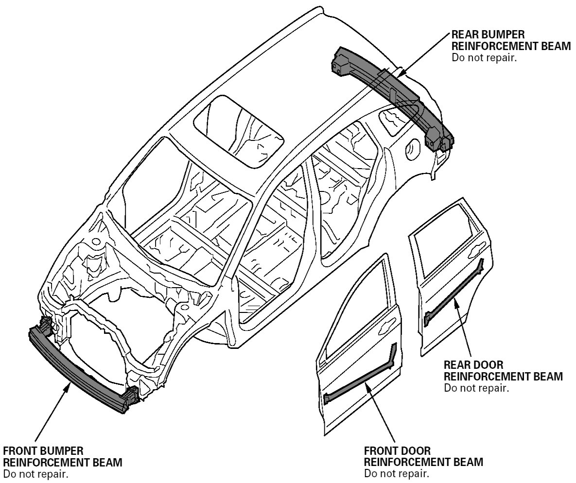 For this reason, door and bumper reinforcement beams should NEVER be repaired; they should be replaced if they are damaged.