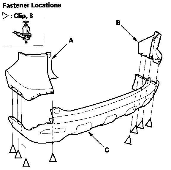 2. Remove the clips, then separate the left rear bumper face (A), right rear bumper face (B) and lower rear bumper face (C).