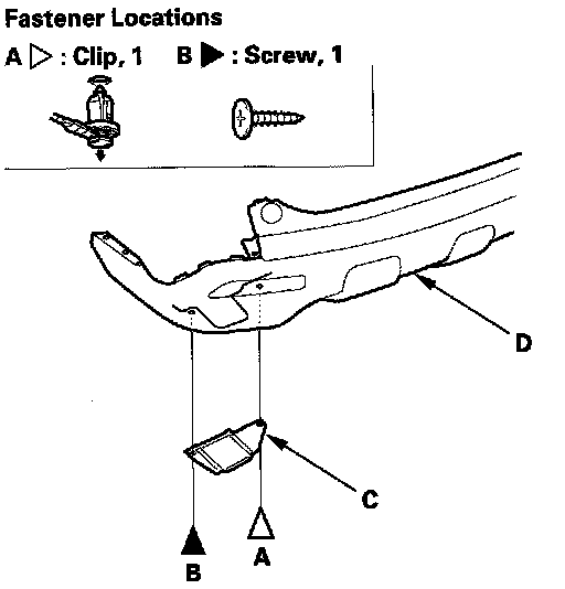 3. Remove the clip (A) and screw (B), then remove the rear bumper under trim (C) from the lower rear bumper face (D).