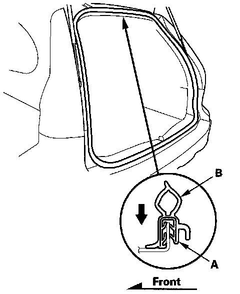 2. Locate the painted alignment mark (A) on the tailgate weatherstrip (B). Align the painted mark with the alignment tab in the center of the tailgate opening, and install the weatherstrip. Make sure it's seated completely and facing in the direction shown. Make sure there are no wrinkles in the weatherstrip.