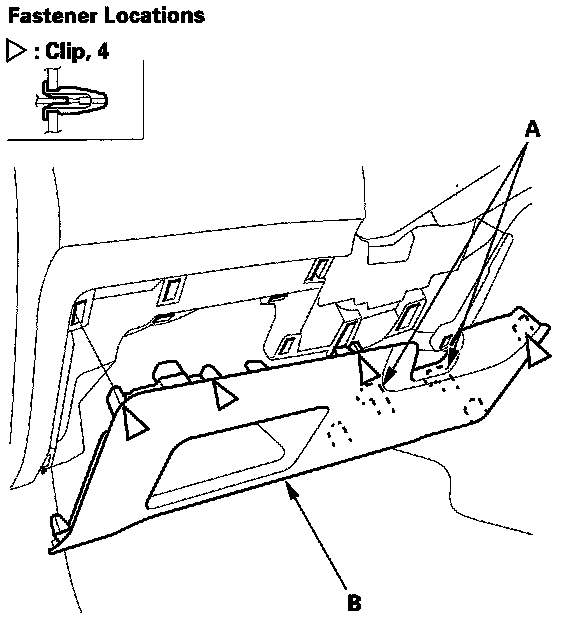 4. Detach the clips, and release the hooks (A) by pulling the driver's dashboard lower cover (B) back.