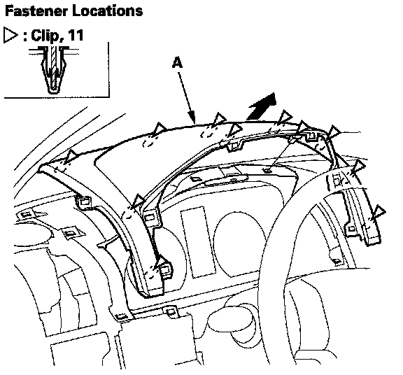 2. Gently pull up the instrument panel (A) by hand from the driver's vent panel and center upper panel openings to release the clips.