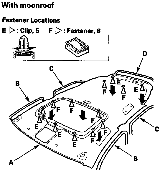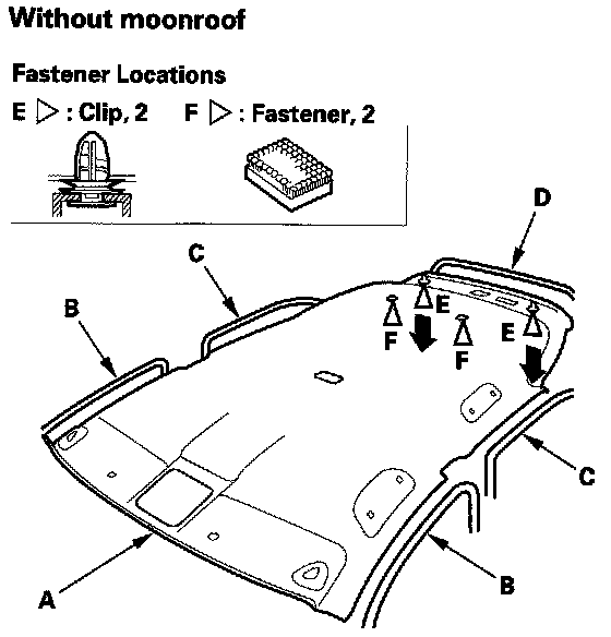2. Release the clips (E) and Velcro fasteners (F) from the headliner by pulling down. Take care not to damage the headliner.