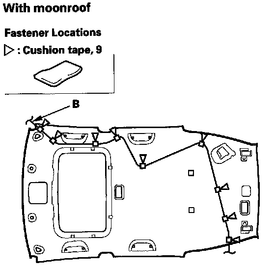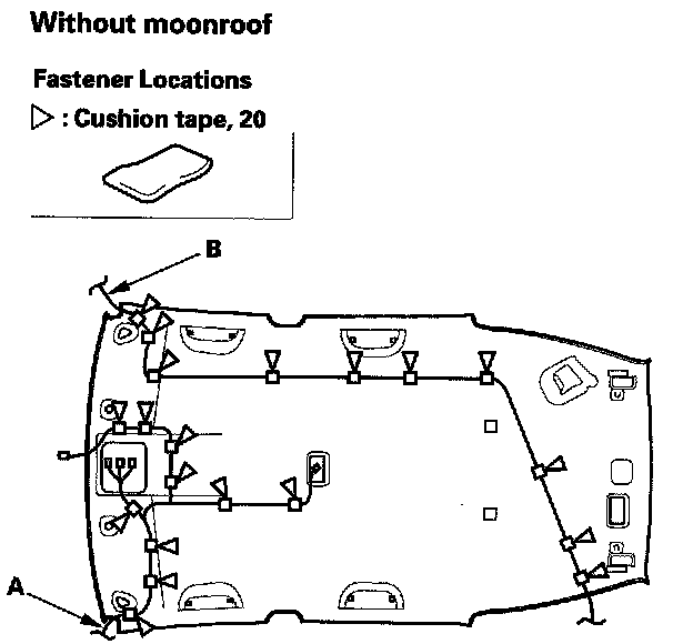 7. Remove the cushion tapes, then remove the interior wire harness (A) and antenna lead (AM/FM) (B) from the headliner.