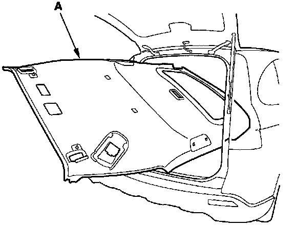 8. With the help of an assistant, pull the headliner (A) out through the tailgate opening. Do not bend the liner. Bending the liner will crease and damage it.