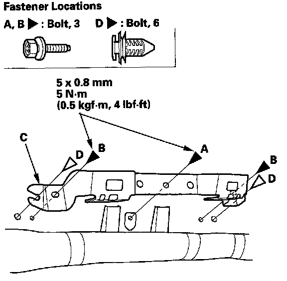 10. If necessary, remove the side curtain airbag mounting bolt (A) and grab handle bracket mounting bolts (B), then remove the grab handle bracket (C) from each side clips (D) by pulling the bracket. Check if clips (Japan-produced model) are damaged or stress-whitened, and if necessary, replace them with new ones.