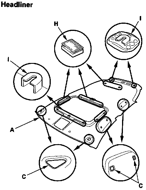- Any Velcro fasteners (H) and clip bases (I) which have come off the headliner