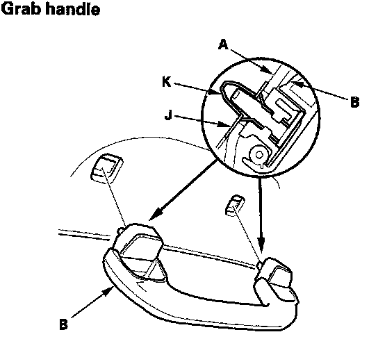 - When installing the grab handle, push on the handle against the bracket (J) until the clips (K) snap into place securely.