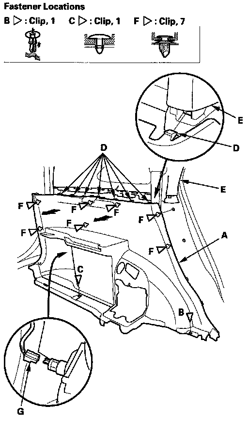 3. Pull out the trim panel back by hand to detach the clips (F) to remove it.