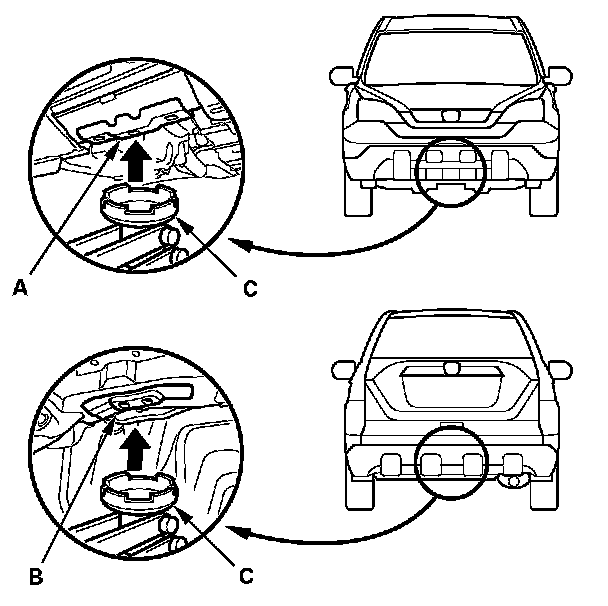 3. Position the floor jack under the front jacking bracket (A) or the rear jacking bracket (B). Center the jacking bracket on the jack lift platform (C), and jack up the vehicle high enough to fit the safety stands under it.