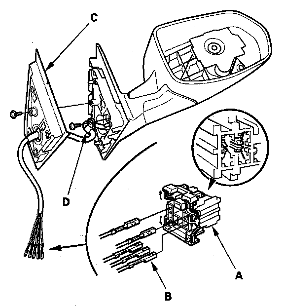 4. Disassemble the power mirror 6P connector, and remove all terminals (B) from the connector.