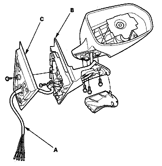 8. Remove the three screws, and separate the mirror housing (B) from the bracket (C).