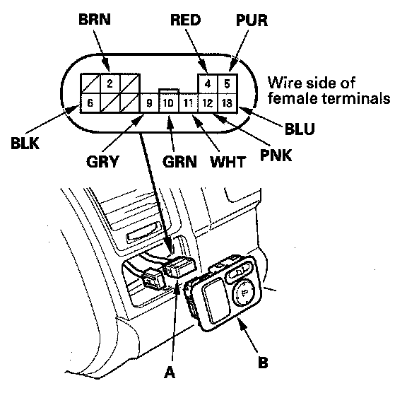2. Disconnect the 13P connector (A) from the power mirror switch (B).