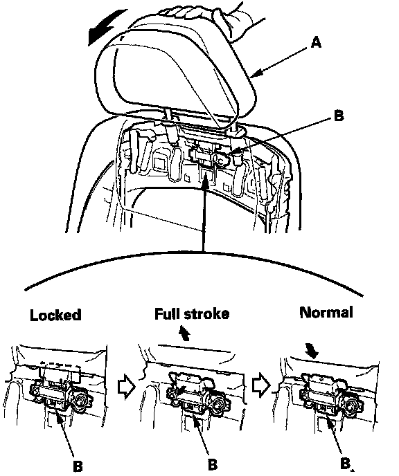1. Push the head restraint (A) forward fully from the locked position to return the inside inertia lock (B).