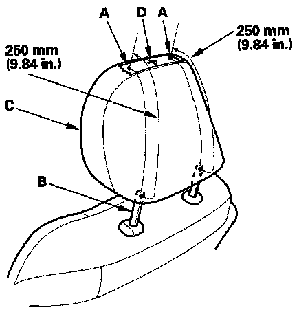 5. Make marks (A) on both sides at 250 mm (9.84 in.) upward from the posts of the head restraint frame (B) along the back of the head restraint (C) surface. Make a center of these points as a datum point (D).