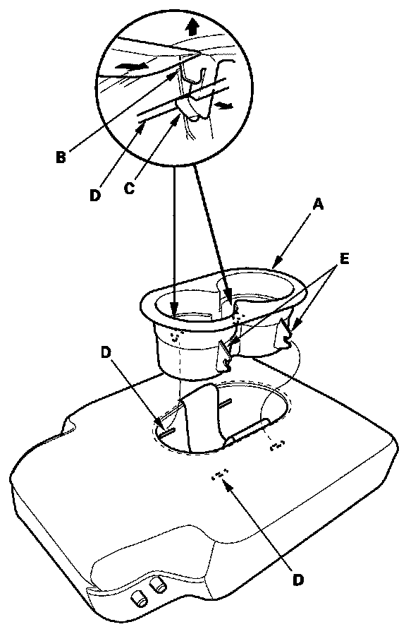 1. Using a trim tool, push on the bottom ribs (B) of the left side hooks (C) to pull up the holder, then release the hooks from the wire (D).