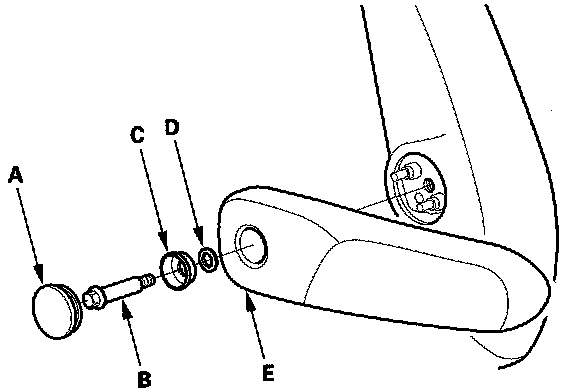 2. Remove the center pin (B), bushing (C), and washer (D), then remove the armrest (E).
