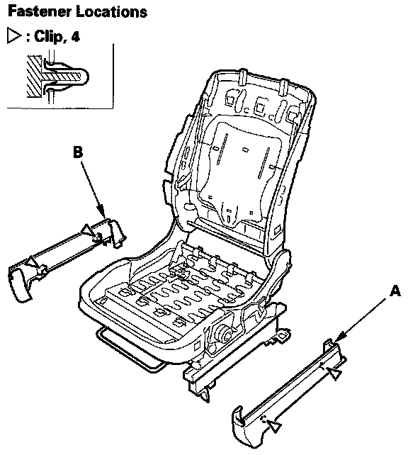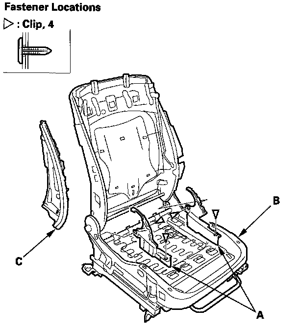 4. Remove the clips, then remove the recline inner covers (A) from the seat frame (B), and remove the module holder (C).