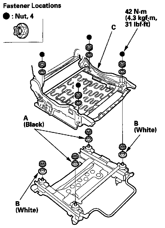 10. Install the new seat frame in the reverse order of removal, and note these items:
