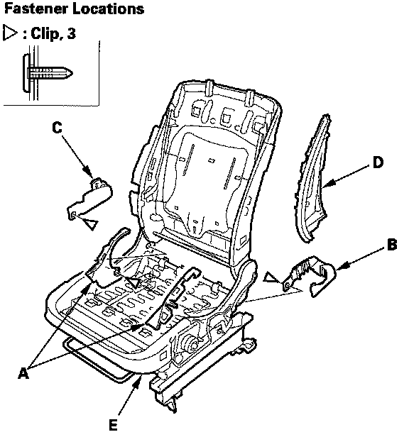 3. Remove the clips, then remove the recline inner covers (A), outer upper rail cover (B), inner upper rail cover (C), and the module holder (D) from the seat frame (E).