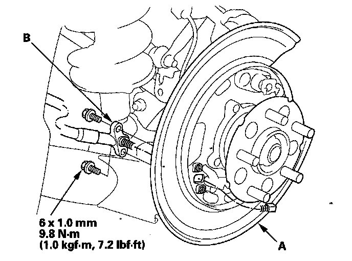 3. Remove the parking brake cable mounting bolts from the backing plate (A), and remove the parking brake cable (B).