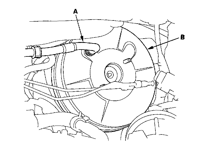 3. Disconnect the vacuum hose (A) from the brake booster (B).