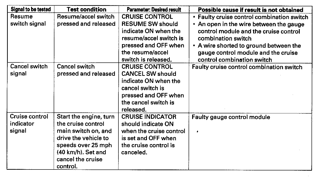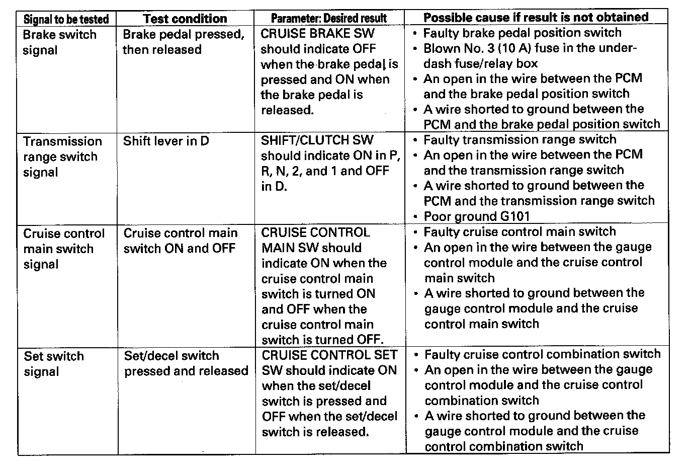 NOTE: Intermittent failures are often caused by loose circuit connections. While monitoring cruise control inputs, flex their circuits, and note if any of the test results change.