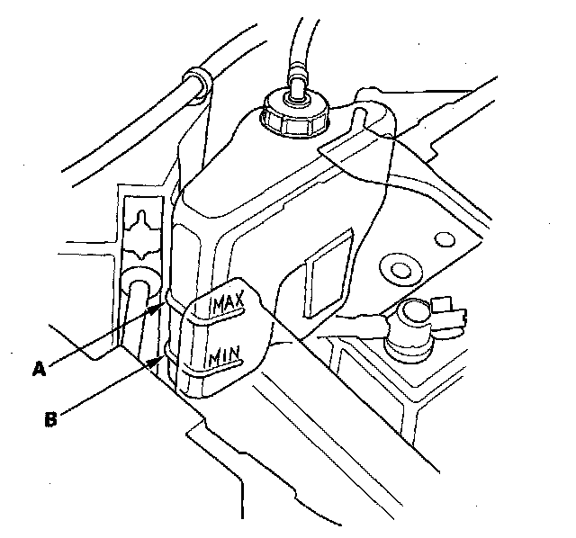 Coolant Check1. Look at the coolant level in the coolant reservoir. Make sure it is between the MAX mark (A) and MIN mark (B).